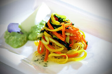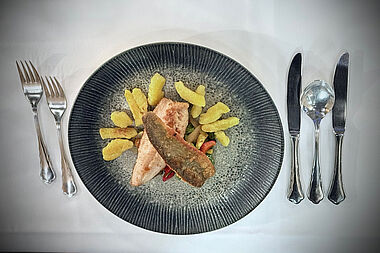 Statt anonymen Speisesaal begrüßet das Küchenteam in einer offenen Küche die Gäste, die in privater Atmosphäre, wie in einem Chalet sitzen. „Es ist eine Küche mit Wohnzimmer. Es soll wie daheim sein. Einfach etwas anderes mit eigenem Charakter. Nichts Klassisches. Wir sind nicht Hokuspokus sondern einfach gstanden und wollen, dass sich alle wohlfühlen“, sagt Gerhard, der die Küche überhat. Sein Bruder Robert verantwortet den Service. Eine offene Küche war von Beginn der Grundgedanke. „Beim Kochen müssen wir uns nicht verstecken. Es sind eh’ lauter fesche Leit' drin“, ergänzt Gerhard. Wer in die Speisekarte schaut, entdeckt fast ausschließlich Regionales, zur Gänze hausgemacht.